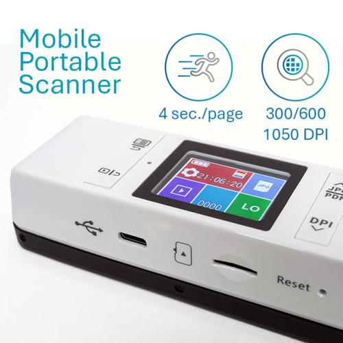 IRIScan Book 7 Dyslexic - Cordless, fully portable & autonomous, high resolution portable colour scanner, to scan magazines’ pages, books’ pages up to A4 size; new “Double Roller” design, double roller drive scanning, makes scanning extra stable; 300/600/1050 dpi scanning resolutions; Scanning speed: 4 sec./page; directly scan to PDF and JPEG; save scans onto the provided MicroSD™ card; 1.5” Color screen; Up to 200 A4 pages per day; Lithium-ion Polymer USB-C rechargeable battery; READIRIS DYSLEXIC SOFTWARE included.