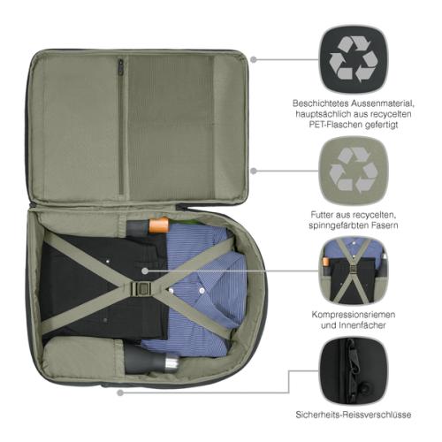 Realizat dintr-un material exterior rezistent la apa, obtinut din PET reciclat, si completat de o captuseala din fibre vopsite in masa, rucsacul UrbanOne Travel imbina functionalitatea cu un design modern. Acest rucsac, aprobat pentru bagaj de cabina, dispune de un compartiment captusit pentru laptopuri de pana la 15.6", un compartiment principal spatios cu deschidere completa tip clamshell si multiple buzunare, inclusiv compartimente frontale cu acces rapid si un buzunar ascuns de siguranta. Fermoarele de siguranta mentin obiectele personale protejate, pentru o experienta de calatorie fara griji.